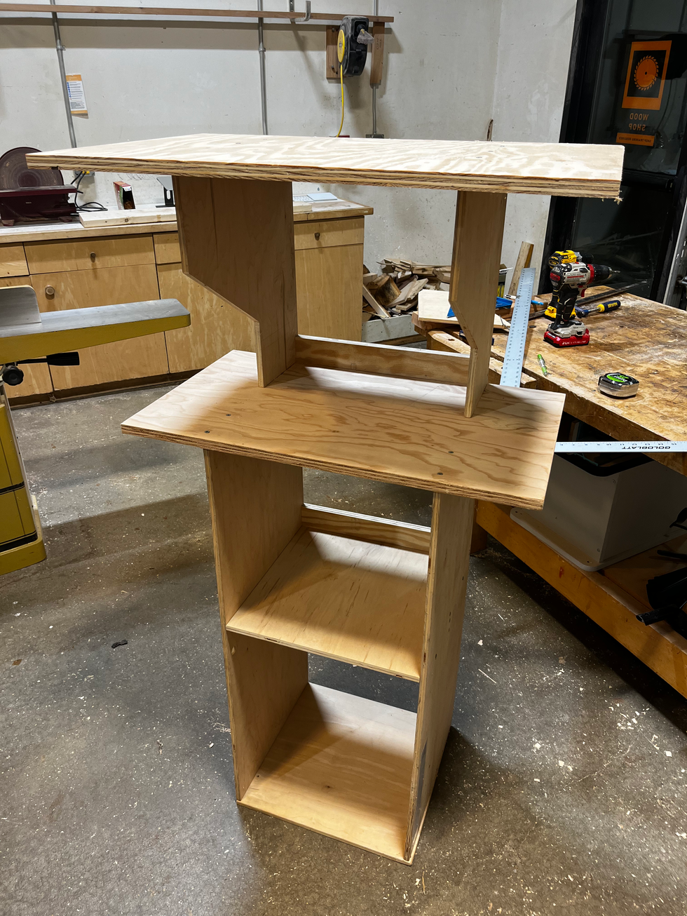 The top shelf holds two monitors, the middle shelf is at keyboard height, and there's storage below. Works as a seated desk too with a tall folding chair. It was a great free and quick build!